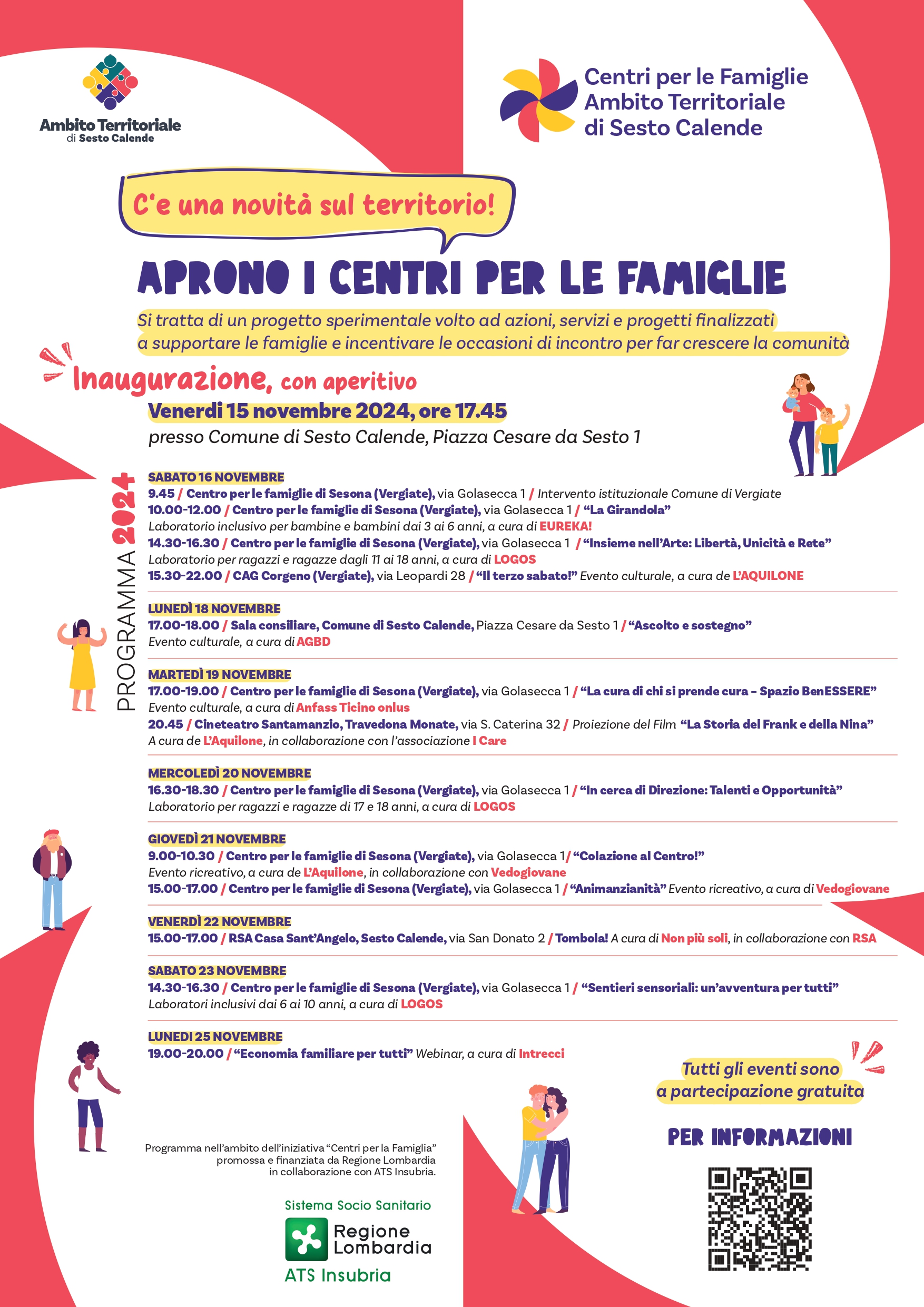 nov 15 2024 Inaugurazione Centri per le Famiglie Ambito Territoriale Sesto Calende ore 17:45 Presso la Sala Consiliare Comune di Sesto Calende - Seguirà aperitivo. venerdì 15 novembre 2024
